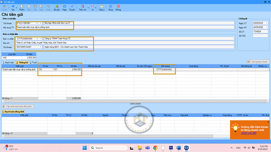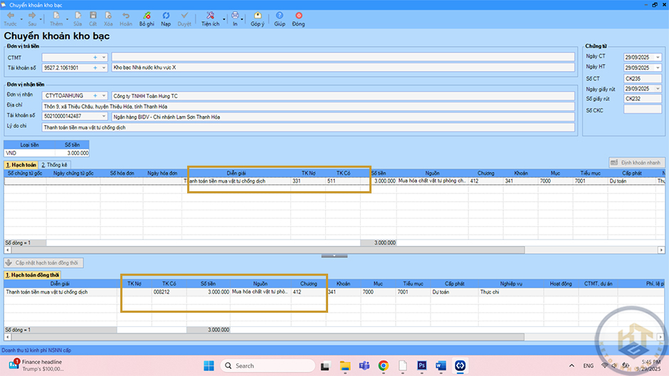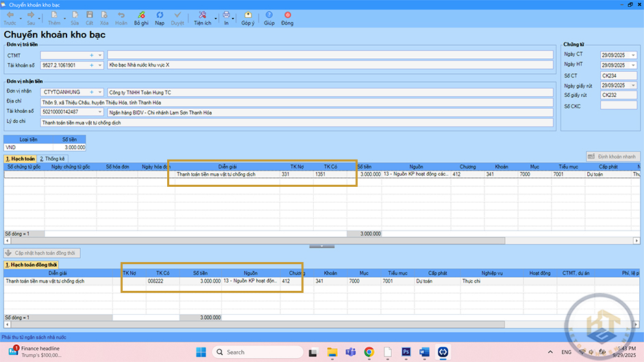 Nhập thông tin đơn vị trả tiền (chọn số TK KB, NH), đơn vị nhận tiền, chứng từ