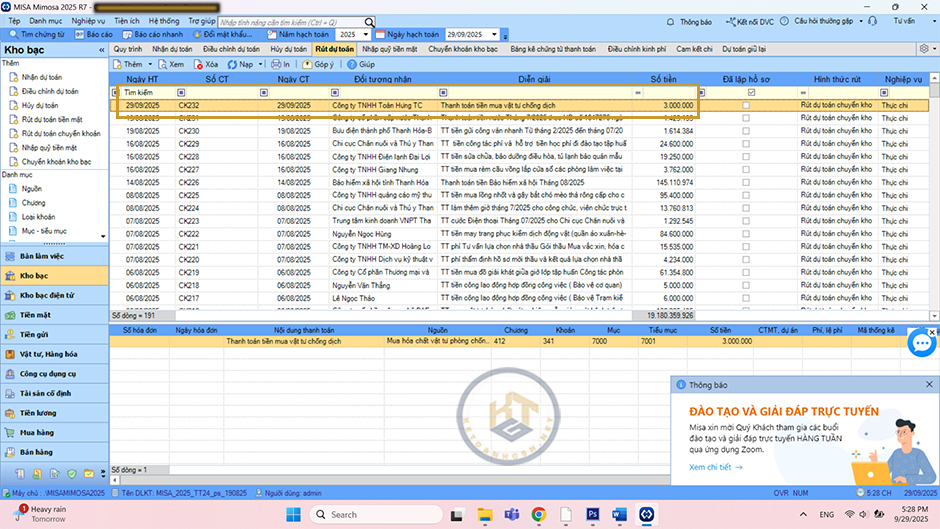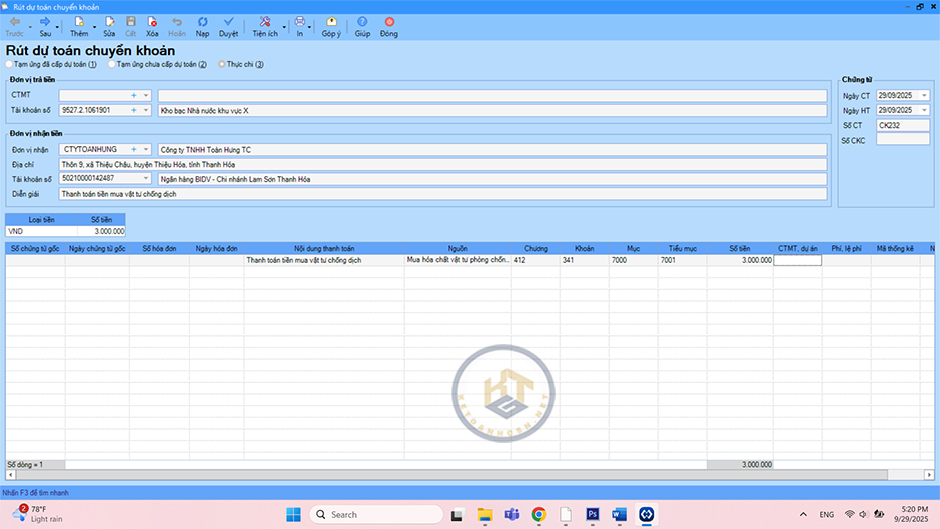 Vào Phân hệ Kho bạc/Rút dự toán/Rút dự toán chuyển khoản để lập giấy rút dự toán chuyển khoản. Nhập thông tin đơn vị trả tiền; đơn vị nhận tiền; chứng từ; MLNS