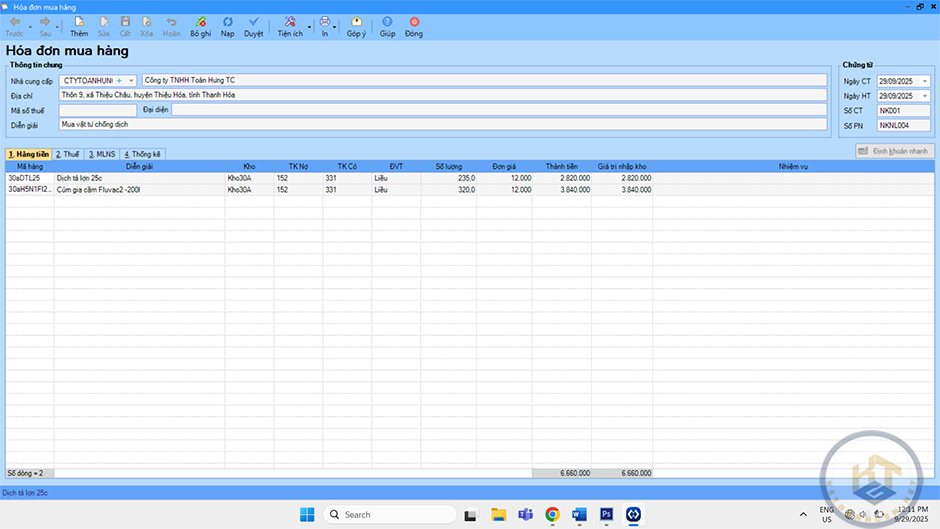 Phần chi tiết Hàng tiền nhập mã hàng, kho. Định khoản Nợ 152, 155, 156/Có 331