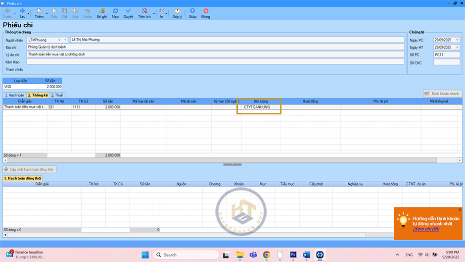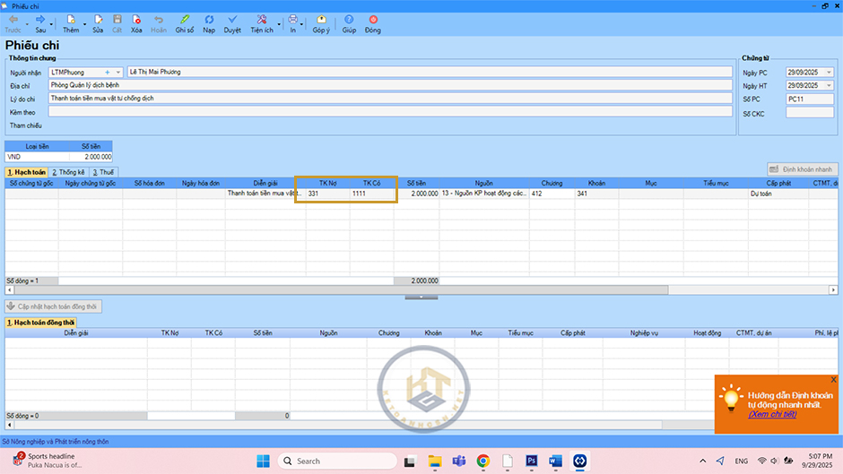 Nhập thông tin chung và chứng từ. Định khoản Nợ TK 331/Có TK 111