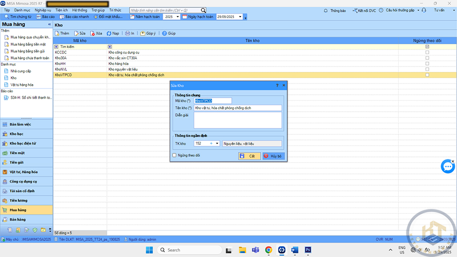 Nhấn thêm để khai báo kho: Nhập mã kho, tên kho tài khoản kho và nhấn Cất