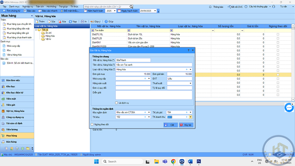 Nếu muốn Sửa vật tư hàng hóa thì nháy đúp chuột vào vật tư hàng hóa cần sửa rồi sửa và Cất