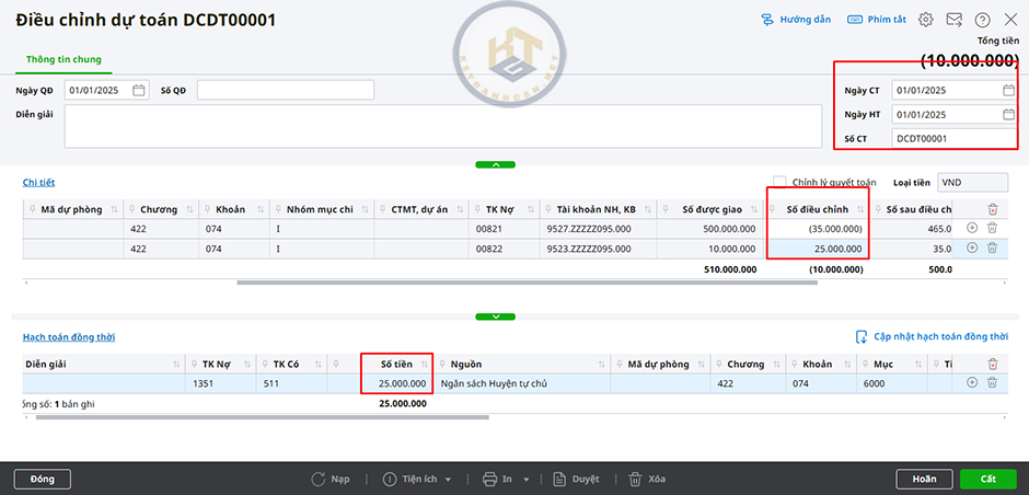 - Nhập Số tiền (lưu ý nhập số âm), Nhóm mục chi, CTMT, Dự án.