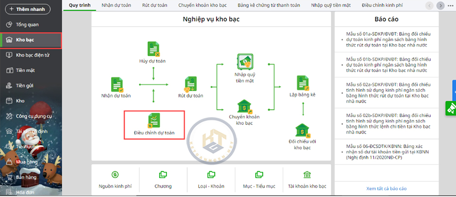 - Vào nghiệp vụ Kho bạc, chọn Điều chỉnh dự toán.