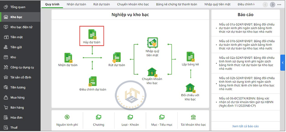 - Vào nghiệp vụ Kho bạc, chọn Hủy dự toán.
