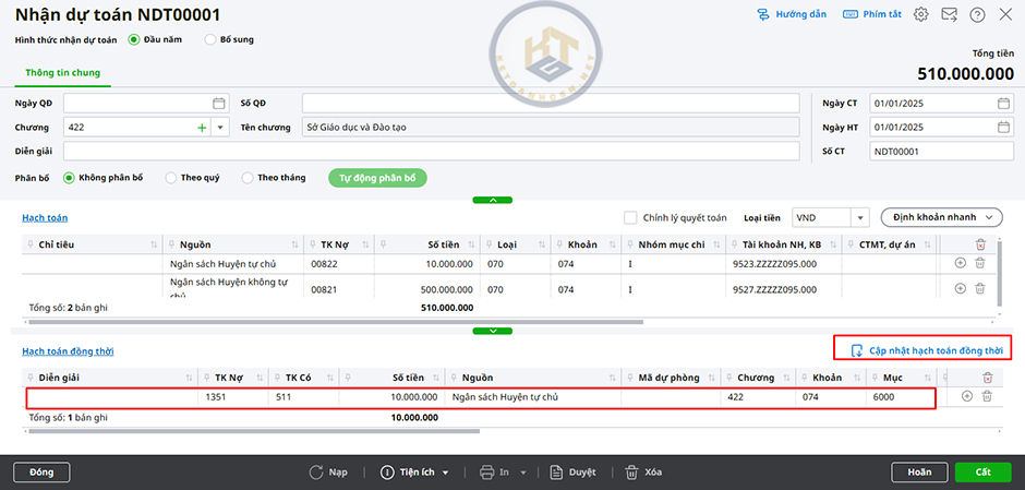 Nhấn cập nhật hạch toán đồng thời: Nợ 1351/Có 511 - Nguồn không giao tự chủ: Nợ 00821