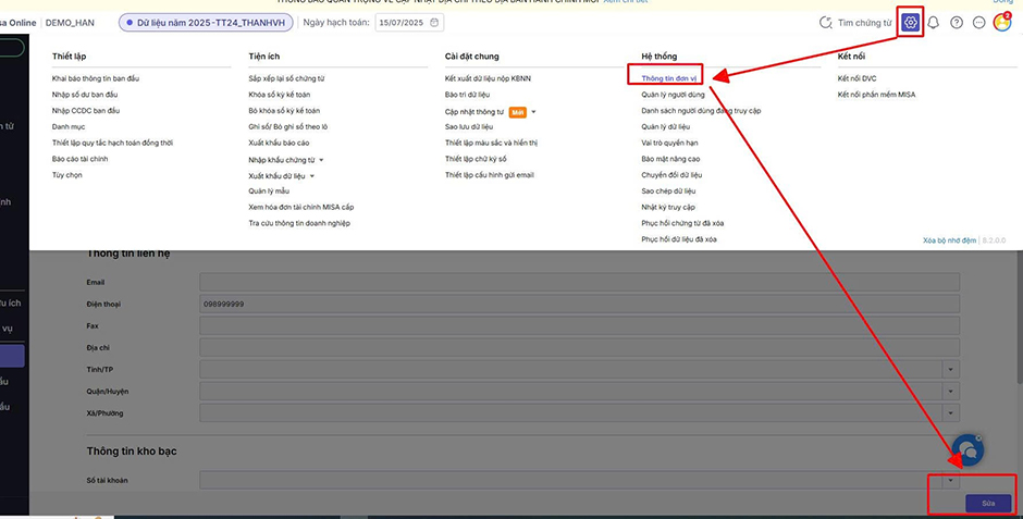 Anh/chị vào Bánh răng cưa/Thông tin đơn vị/Sửa các thông tin: Mã cấp ngân sách từ cấp 3->4, địa chỉ, đơn vị chủ quản sau đó nhấn CẤT
