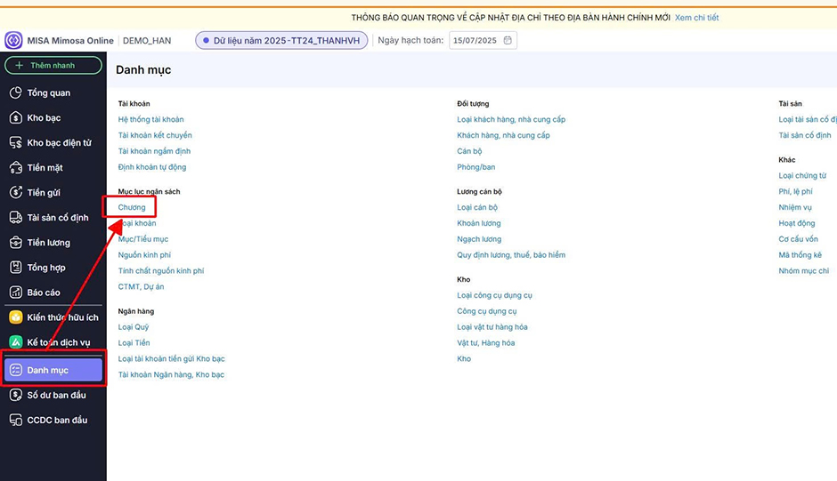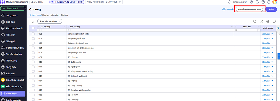 -Thực hiện: Vào Danh mục/ Chương/ Chuyển chương hạch toán