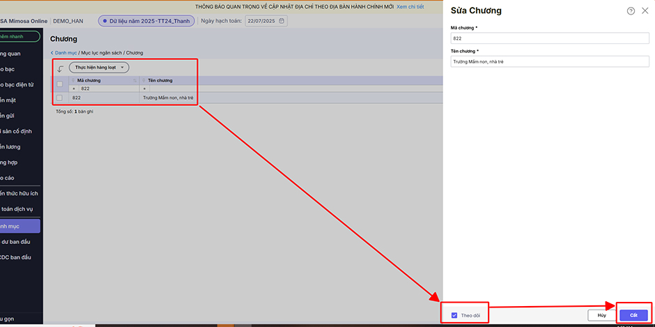 - Bước 3: Tích theo dõi chương 822 và thay đổi mã chương