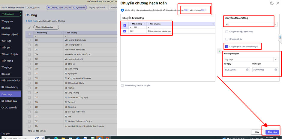 Chọn các thông tin chuyển từ chương 622 sang chương 822, thời gian chuyển chứng từ 01/01/2025-31/07/2025 (hoặc chọn tới 31/12/2025 đều được)