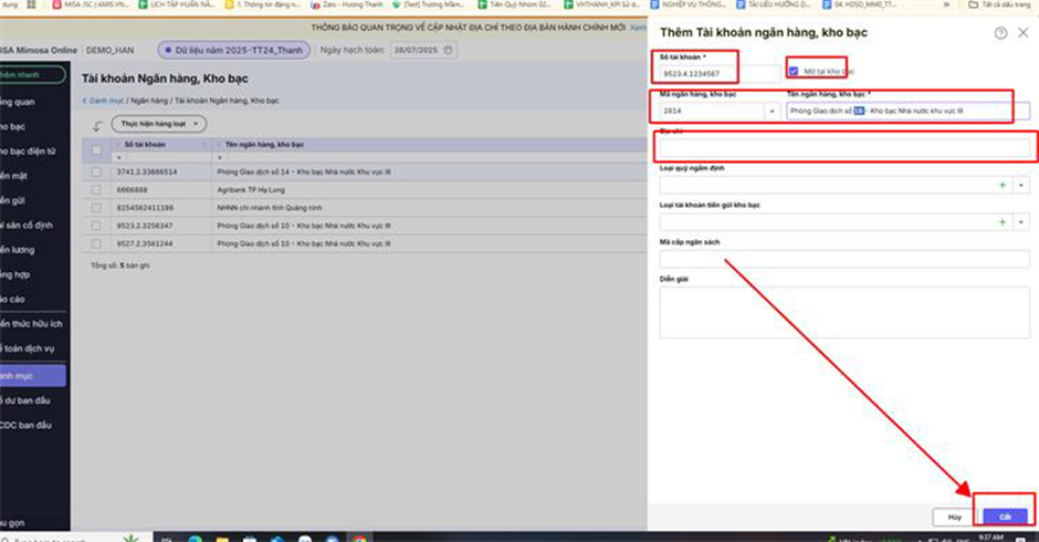 - Tích vào tài khoản kho bạc/ nhấn thêm, điền số tài khoản, tích mở tài kho bạc, nhập đúng mã kho bạc, nếu tên kho bạc sai sửa lại tên, điền địa chỉ rồi nhấn cất