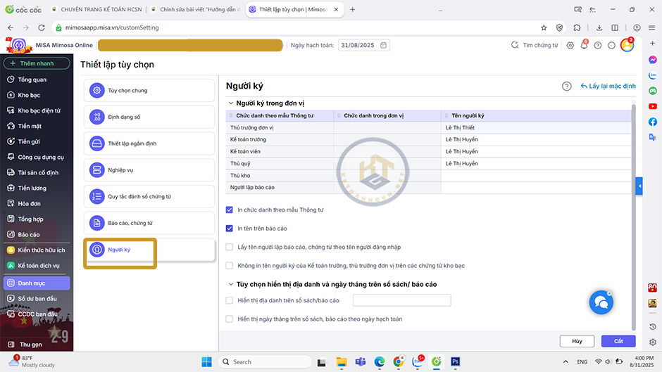 - Tích chọn In chức danh theo mẫu thông tư, In tên trên báo cáo hoặc Không in tên người ký của Kế toán trưởng, thủ trưởng đơn vị trên các chứng từ kho bạc.