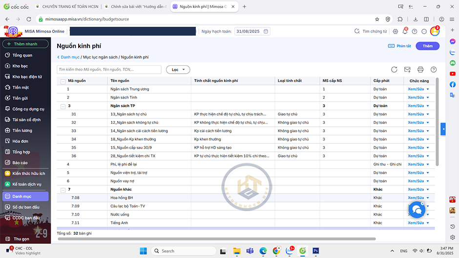 - Để thêm mới nguồn kinh phí, chọn vào dòng nguồn kinh phí tổng hợp cần thêm, nhấn Thêm.