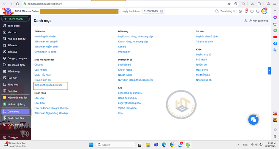 - Chọn menu Danh mục\Tính chất nguồn kinh phí.