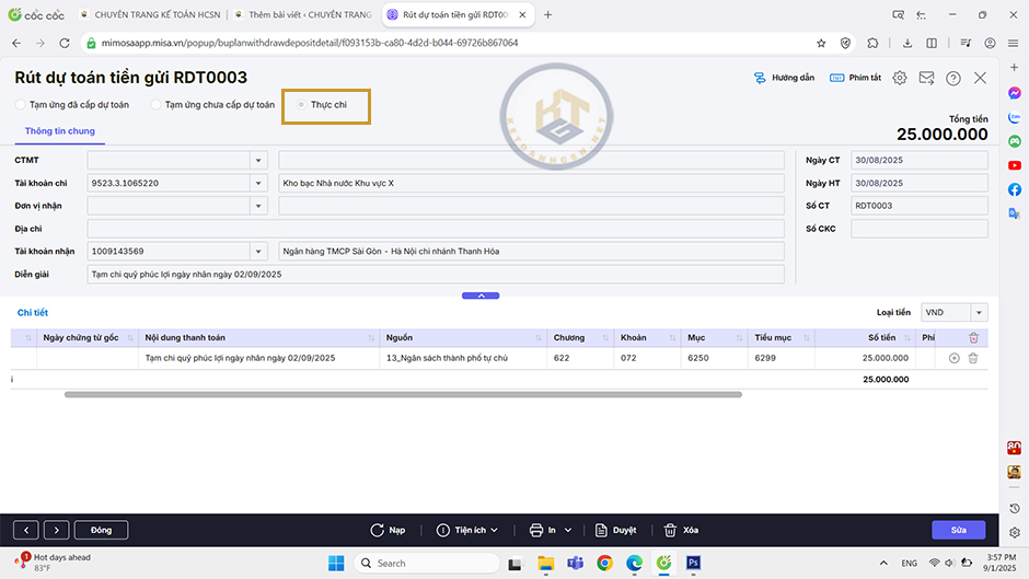 Khai báo thông tin về chứng từ Rút dự toán tiền gửi. Chọn Thực chi