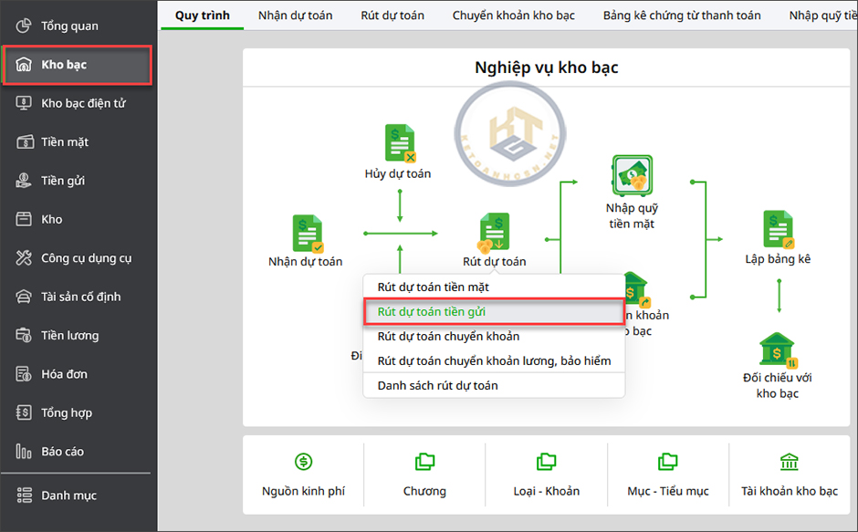 Vào nghiệp vụ Kho bạc, chọn Rút dự toán\Rút dự toán tiền gửi: