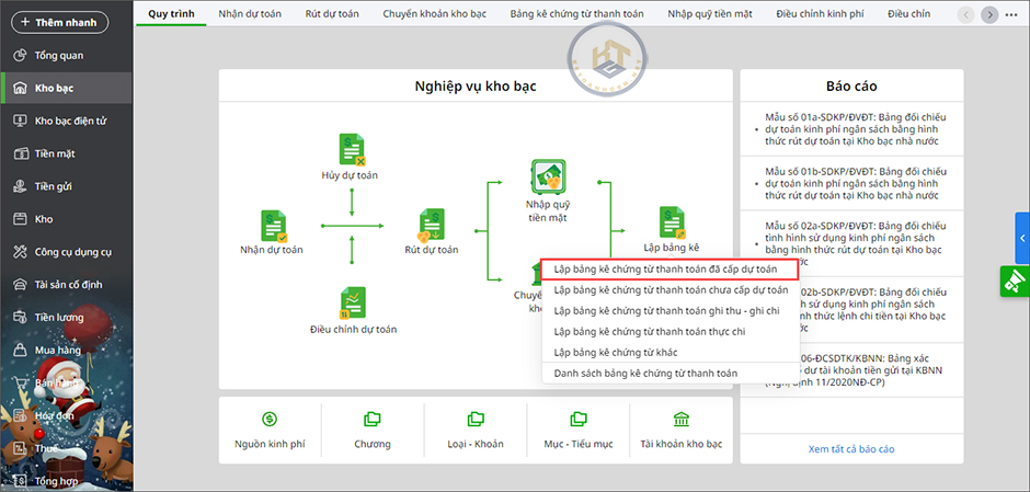 Vào phân hệ Kho bạc, chọn Lập bảng kê\Bảng kê chứng từ đã cấp dự toán.