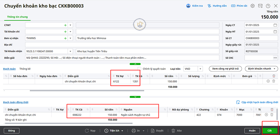 Nhấn Cất. Hệ thống hiển thị màn hình thông báo “Bạn có muốn sinh chứng từ Chuyển khoản kho bạc không?“ , nhấn Có.