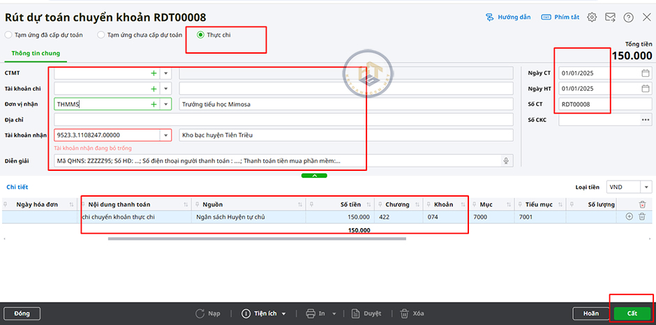 Tài khoản chi: lựa chọn hoặc khai báo thêm tài khoản ngân hàng, kho bạc.