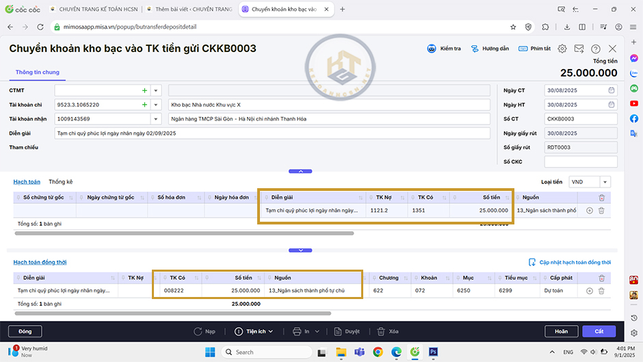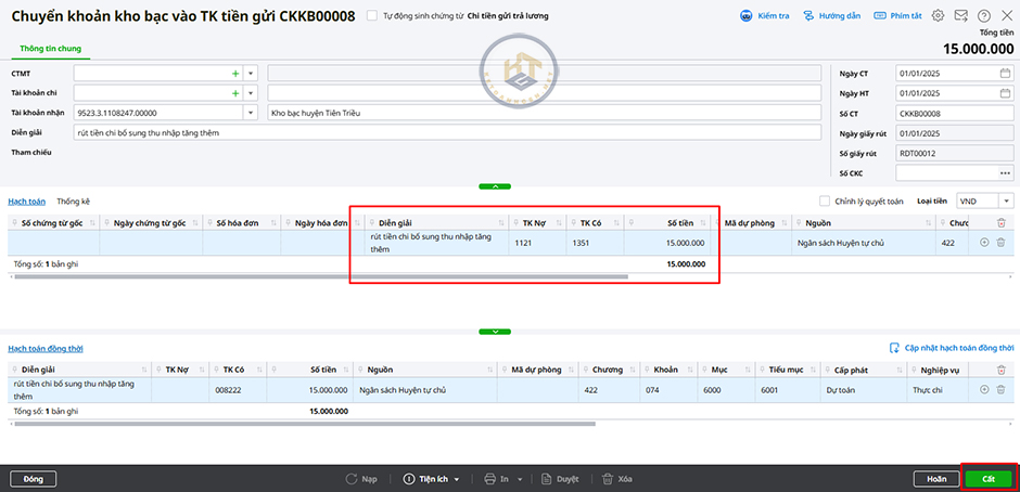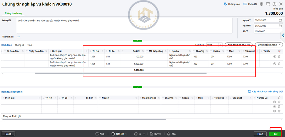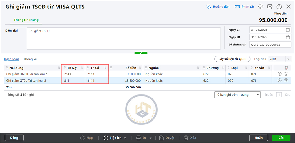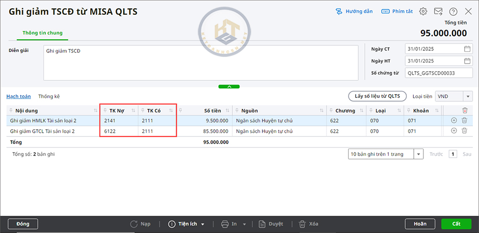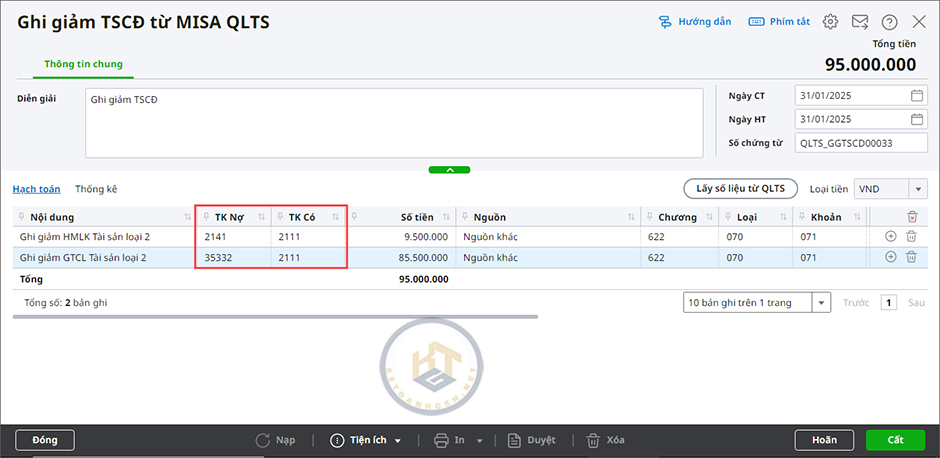 4. Mở chứng từ ghi giảm TSCĐ vừa lấy từ phần mềm MISA QLTS để kiểm tra bút toán hạch toán đã đúng chưa. Nếu sai, nhấn Bỏ ghi\Sửa để sửa lại bút toán hạch toán cho phù hợp với nguồn kinh phí.