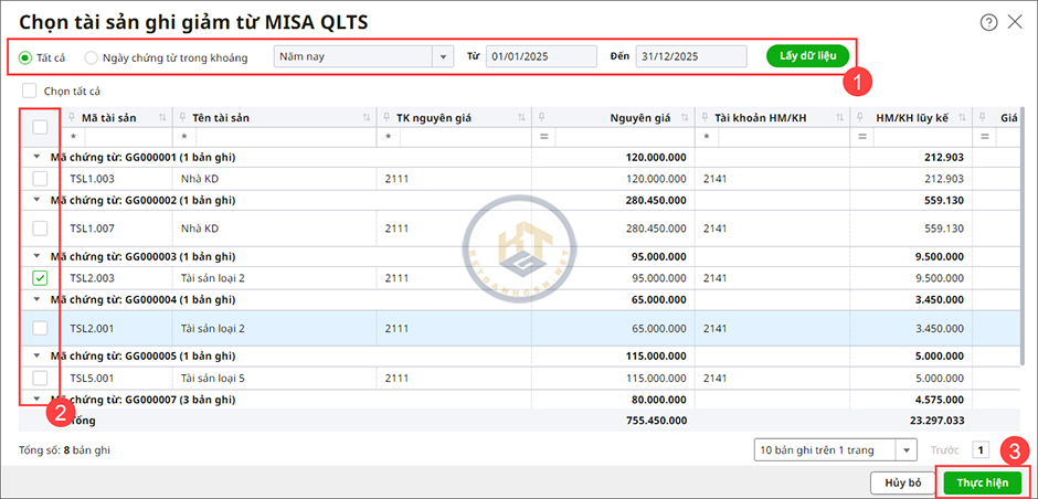 3. Khai báo thông tin tại màn hình Chọn tài sản ghi giảm từ MISA QLTS.