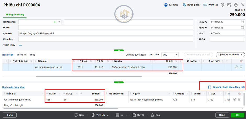 - Hệ thống sinh chứng từ đồng thời tại tab Hạch toán đồng thời.