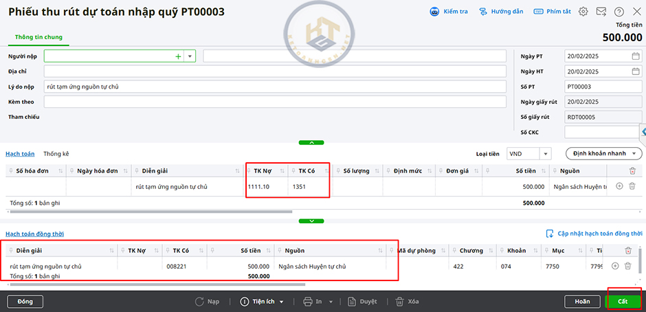 6. Kiểm tra lại thông tin trên Phiếu thu rút dự toán nhập quỹ được lấy từ chứng từ Rút dự toán tiền mặt sang. Nợ TK 1111/ Có TK 1351 ĐT: Có TK 008211/ Nhấn Cất.