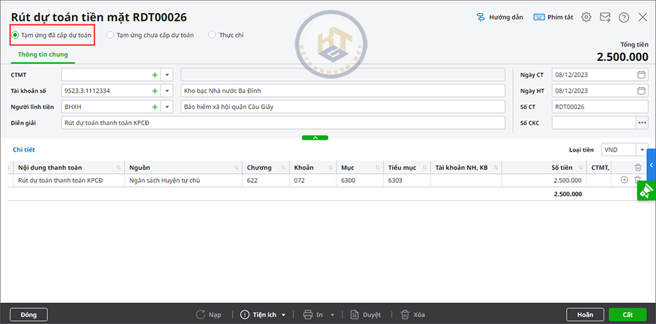 - Tích chọn Tạm ứng đã cấp dự toán.