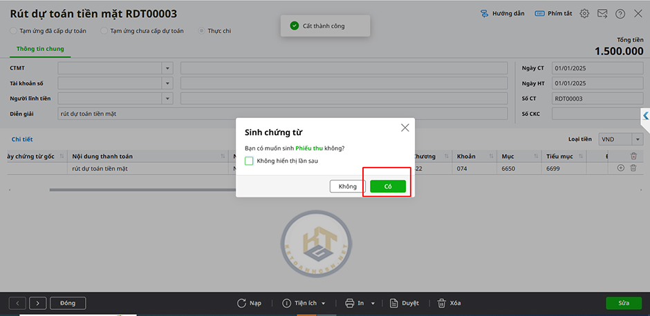 5. Nhấn Có khi hệ thống hiển thị thông báo “Bạn có muốn sinh Phiếu thu không?”.