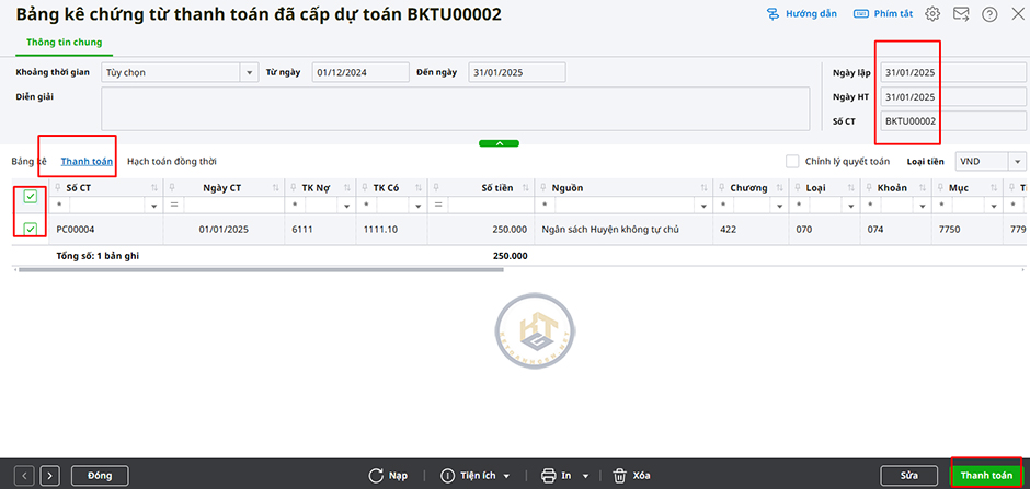 Tích chọn các chứng từ đã được kho bạc chấp nhận thanh toán. Nhấn Thanh toán trên thanh công cụ.