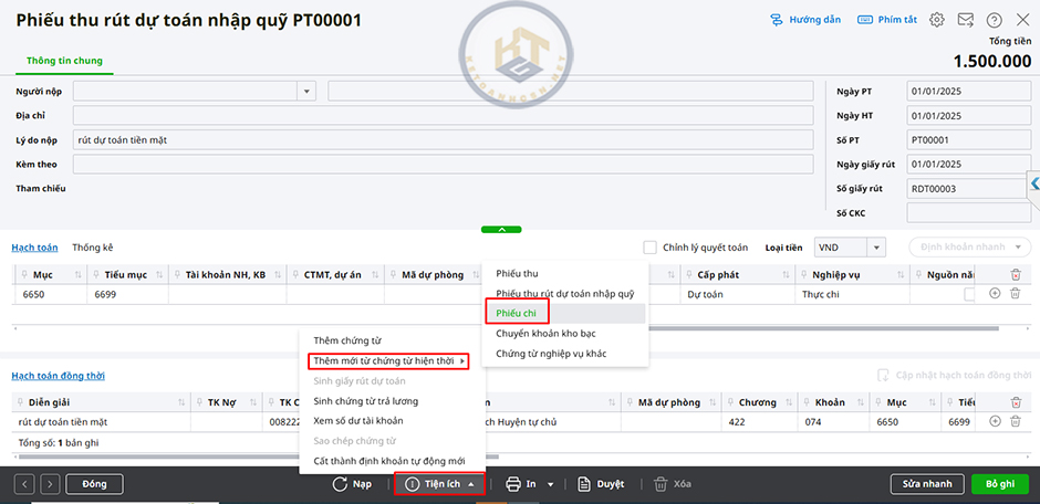 1. Trên màn hình phiếu Thu rút dự toán nhập quỹ/ Tiện ích/ Thêm mới từ chứng từ hiện thời/Phiếu chi