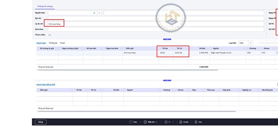 Điền các thông tin về Lý do chi/ Diễn giải/ Ngày hạch toán, CT / Số tiền.