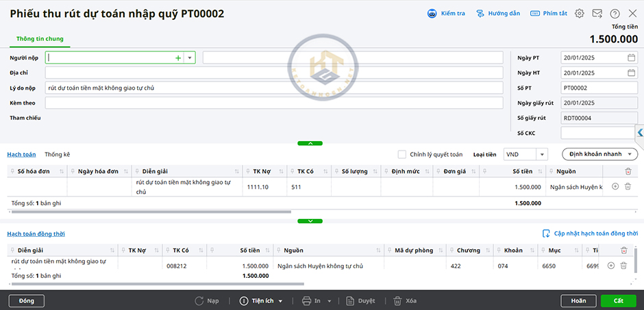 - Anh/chị kiểm tra các thông tin trên Phiếu thu rút dự toán nhập quỹ, phần mềm mặc định sinh TK Nợ 1111, TK Có 511 Thực chi hạch toán đồng thời ghi Có TK 008212.