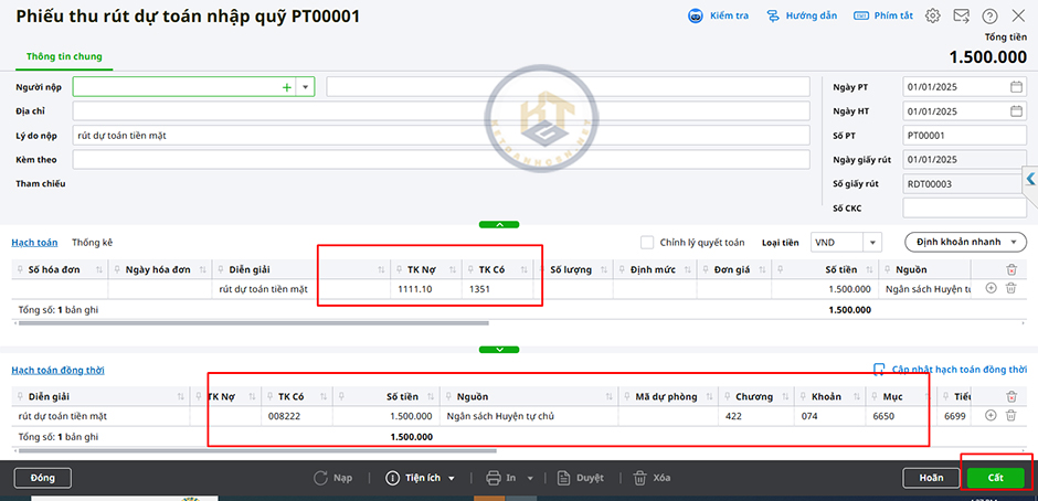 Rút dự toán nhập quỹ tiền mặt